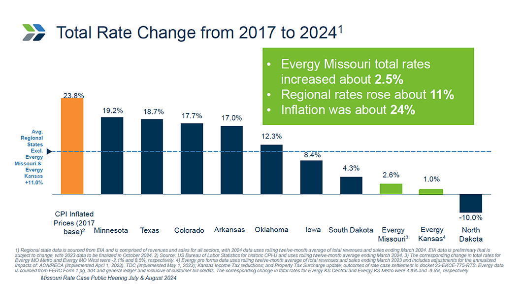 "We are investing strategically to ensure customers have reliable, affordable energy,” said Evergy President and Chief Executive Officer David Campbell. “Our focus continues to be on more efficiently running the business, which despite this period of record inflation has resulted in a reduced increase ask for our customers. While most area states have seen electricity costs increase about 11% over the past six years, Evergy’s prices have remained regionally competitive and even declined in some areas."