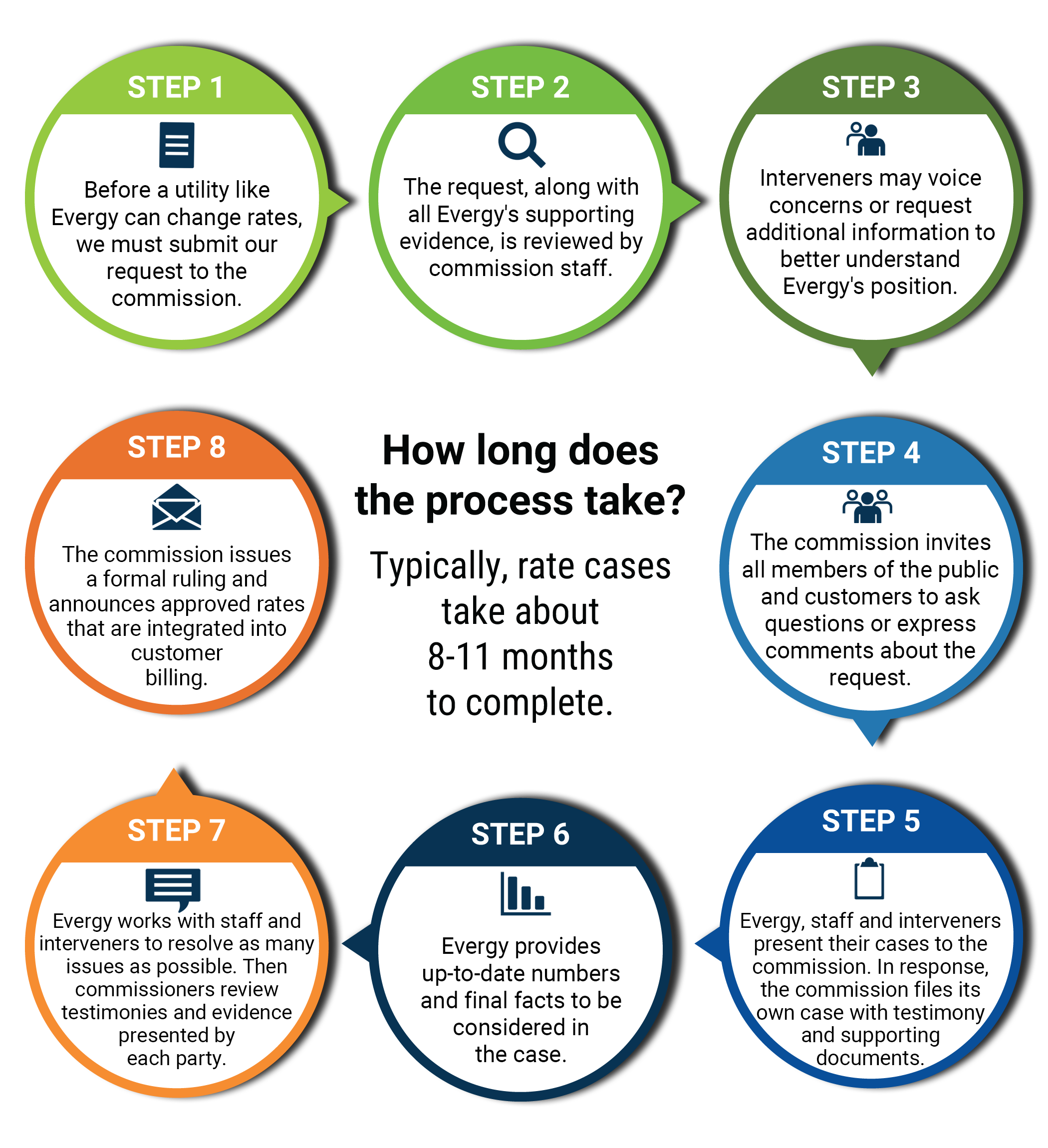 Before Evergy can change rates, we must complete a process called a rate case. The rate case process gives the commission and the public the opportunity to review the request and learn why Evergy's requested a rate change. Learn why rates are regulated by commissions.